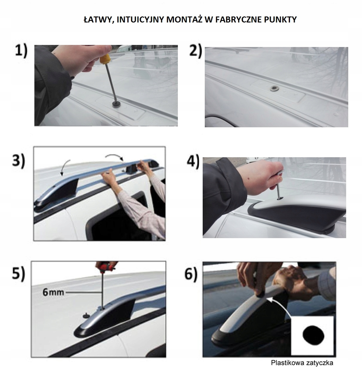 - Prosty montaż (bez zdejmowania podsufitki, relingi mocowane wytrzymałymi śrubami w fabryczne miejsca na dachu samochodu)